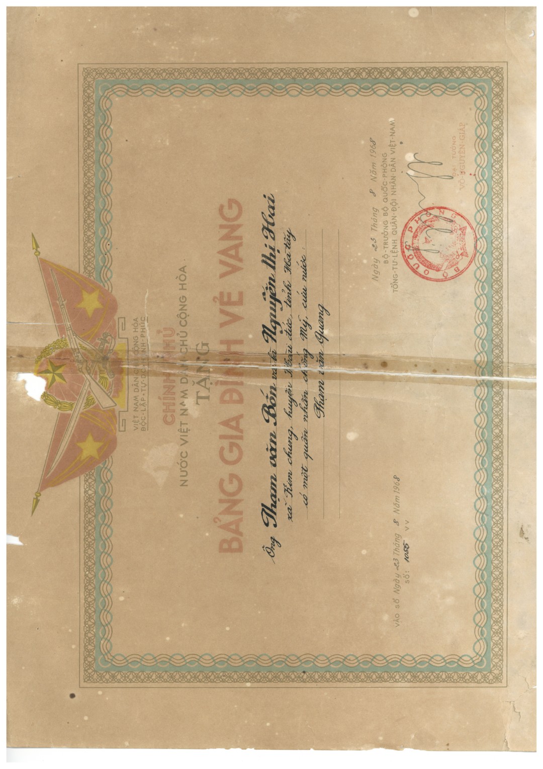 - bị gấp, bị rách (do cách bảo quản của gia đình; thường đựng trong các khung ảnh, hộp, cặp, phong bì nhỏ hơn di vật)