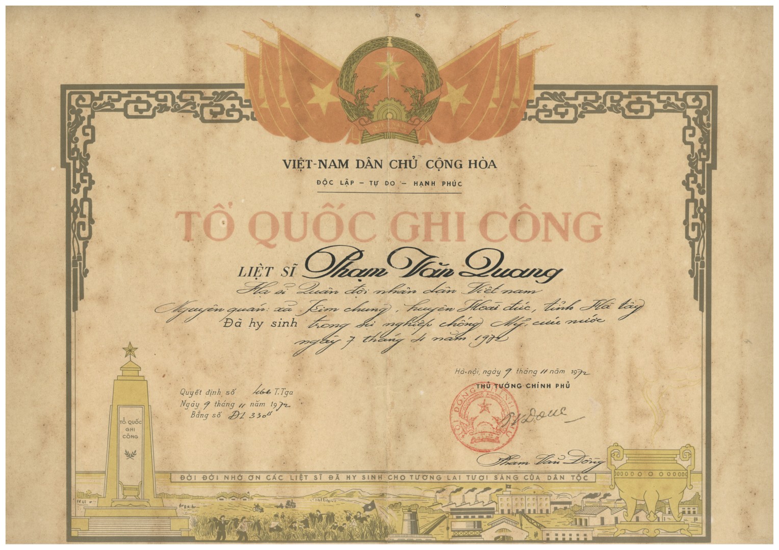Chúng tôi xin bày tỏ lòng tri ân sâu sắc tới gia đình liệt Phạm Văn Quangnhững người đã giữ gìn ức bằng tất cả tình yêu niềm tự hào suốt hơn năm mươi năm qua.