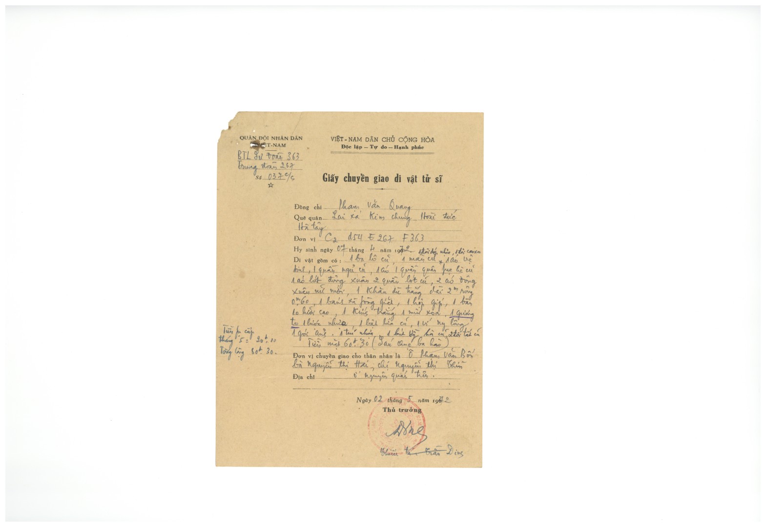 MặcGia đình đã giữ lại được nhiều di vật (ảnh chân dung, giấy báo tử, giấy nhận di vật, bằng tổ quốc ghi công, các bằng khen….) của liệt sỹ nhưng duy nhất chỉ còn một tấm ảnh chân dung chụp ông trước ngày lên đường nhập ngũbức ảnh được lưu truyền qua 2 thế hệ, kỷ vật thiêng liêng nhất của gia đình.